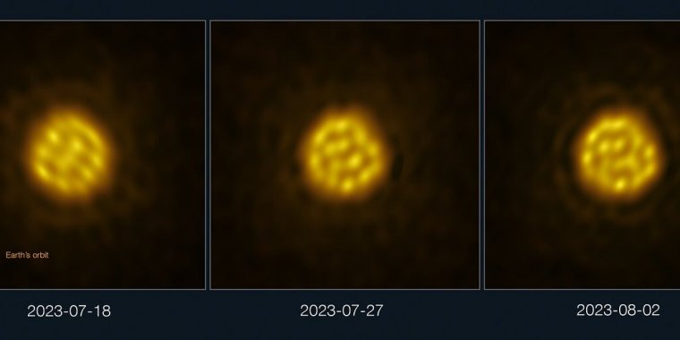 Per la prima volta, alcuni astronomi hanno catturato le immagini di una stella diversa dal Sole con un dettaglio sufficiente a tracciare il movimento del gas che forma bolle sulla superficie. Le immagini della stella, R Doradus, sono state ottenute in luglio e agosto 2023 con ALMA (Atacama Large Millimeter/submillimeter Array), un telescopio di cui l'ESO (European Southern Observatory) è partner: mostrano gigantesche bolle di gas caldo, 75 volte più grandi del Sole, che appaiono sulla superficie e sprofondano di nuovo nell'interno della stella più velocemente del previsto.