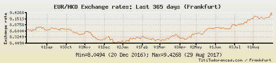1 Euro = 9.2080 dollari di Hong Kong