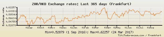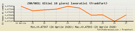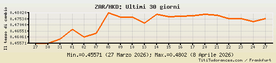 1 Rand sudafricano = 0.4756 dollari di Hong Kong